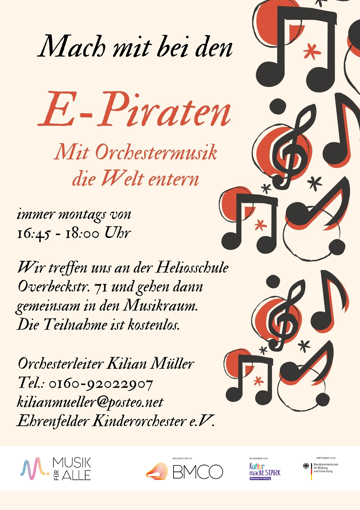 Die E-Piraten sind ein Orchester für alle Anfängerinnen, die Lust haben mit anderen gemeinsam Musik zu machen und bereits Instrumentalunterricht haben. Wir proben immer montags von 17:00-18:00 Uhr in der Heliosschule in der Overbeckstraße 71. Um 16:45 Uhr treffen wir uns auf dem Pausenhof, komm einfach dazu und mach mit uns Musik.
